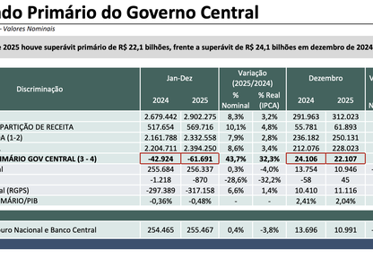 Governo Federal apresentou déficit de R$ 61,7 bilhões no seu Resultado Primário de 2025