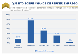 Pesquisa FGV-IBRE aponta que 56,5% dos respondentes afirma ser muito improvável ou improvável perder seu principal emprego ou renda nos próximos 6 meses