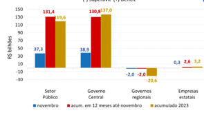 CONTAS: Déficit primário em novembro de 2023 foi de R$ 37,3 bilhões, enquanto em novembro de 2022 foi de R$ 20,1 bilhões, informa estatísticas fiscais do BC