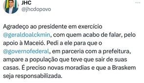 JHC anuncia conversa com Geraldo Alckmin para pedir apoio para as famílias que são evacuadas face aos afundamentos em Maceió; ontem, ministro Renan Filho disse que agendou encontro do governador Paulo Dantas com Alckmin