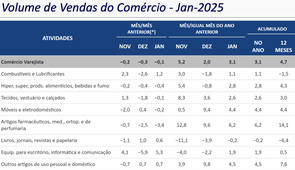 Comércio varejista recuou -0,01% em janeiro de 2025, informa IBGE, mas o comercio ampliado registrou alta de 2,3% em janeiro