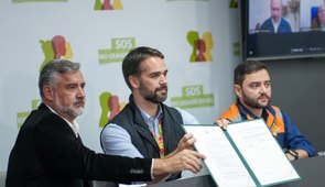 Eduardo Leite, ao lado de Paulo Pimenta, sanciona o o Plano Rio Grande e o Fundo do Plano Rio Grande (Funrigs); iniciativa é lançada para dar as bases da reconstrução do RGS após a crise das enchentes/chuvas
