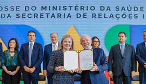 Gleisi Hoffmann, em fala de posse, faz aceno ao ministro da Fazenda, Fernando Haddad, e diz que vai apoiar suas pautas; presidentes de partido do Centrão não foram ao evento, mas chefes do Legislativo, sim