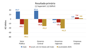 Em maio, Governo Federal e as empresas estatais apresentaram déficits de R$37,4 bilhões e R$926 milhões, enquanto os governos regionais, superávit de R$4,5 bilhões, informa Banco Central