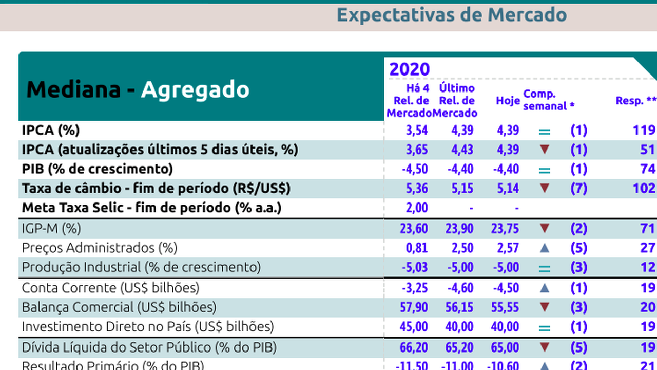 Com vista a expectativa do Produto Interno Bruto(PIB), se estima que a atividade econômica irá recuar -5,15% neste ano. Há quatro semanas o mercado estimava um recuso de -5,36%.