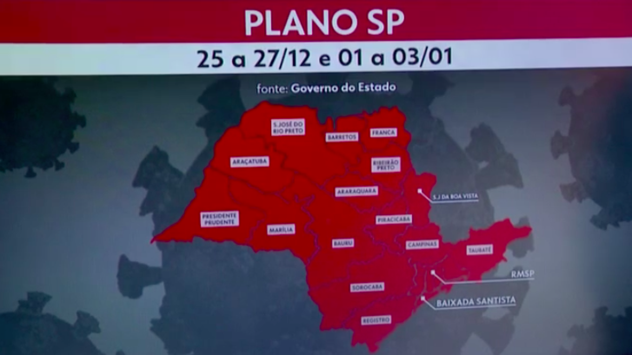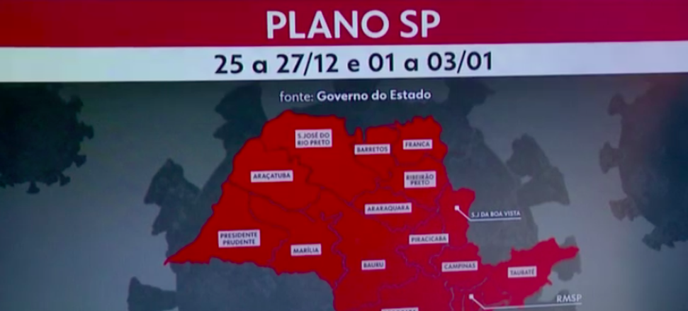 (Brasília-DF, 01/01/2021) A partir deste 1º de janeiro de 202, todo o Estado de São Paulo com os seus 645 municípios devem voltar à fase 1-vermelha do Plano São Paulo. A medida vale por todo o final de semana nos dia 2 e 3 de janeiro.