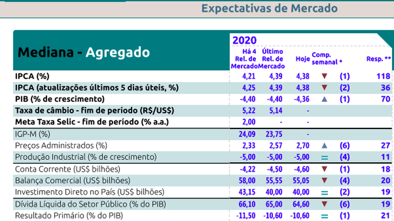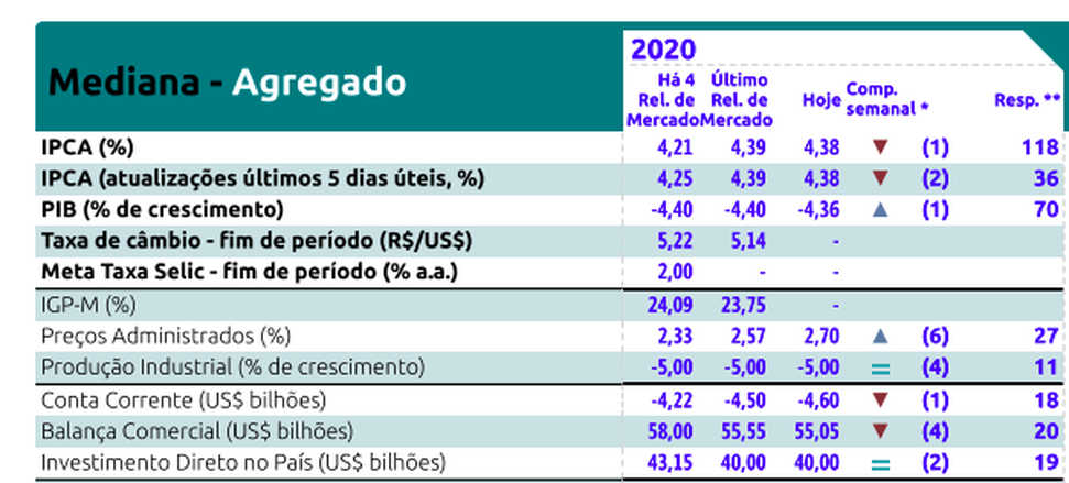 FOCUS: Relatório aponta mercado estimando inflação em 4,38% e PIB 2020 em -4,36%