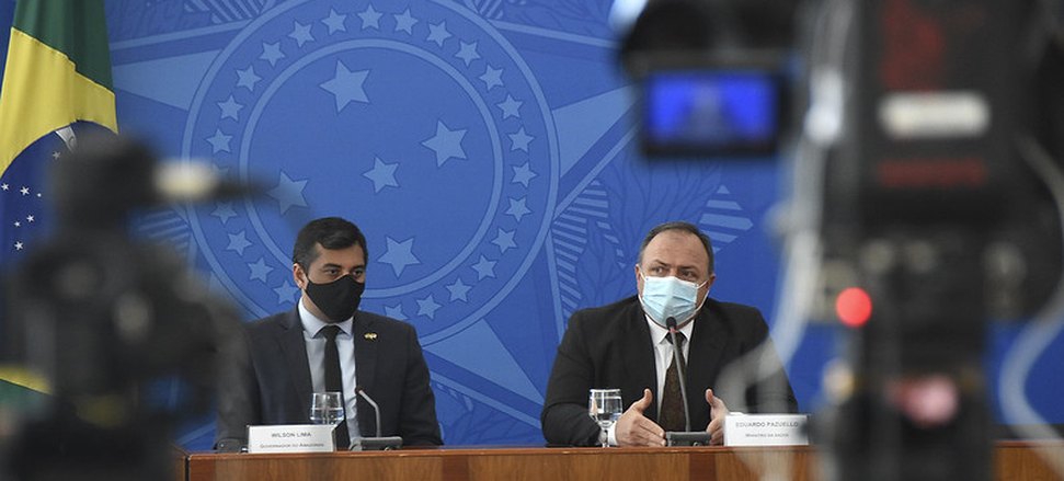 (Brasília-DF, 19/01/2021) O ministro da Saúde, Eduardo Pazuello, concedeu uma entrevista coletiva na tarde desta segunda-feira,18, ao lado do governador do Amazonas, Wilson Lima(PSC). Antes da coletiva os dois estiveram reunidos com o presidente Jair Bolsonaro(sem partido). O ministro Pazuello não quis informar quais outras autoridades participaram da reunião. O objetivo da reunião era informar que a crise que gerou um colapso no atendido das pessoas atingidas pela pandemia do covid-19 teria sido equacionada, mas o minsitro acabou confirmando que teve conhecimento da iminente falta de oxigênio em Manaus(AM) no dia 8 de janeiro.