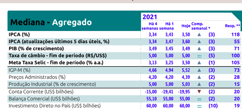 (Brasília-DF, 26/01/2021) Nesta segunda-feira,25, foi divulgado o relatório Focus do Banco Central fechado ainda na sexta-feira,22, revelando que o mercado estima que o Produto Interno Bruto(PIB) de 2021 será de 3,49%. Os números referente ao IPCA, que vem a ser a inflação oficial do País é estimada em 3,5%, na evolução.