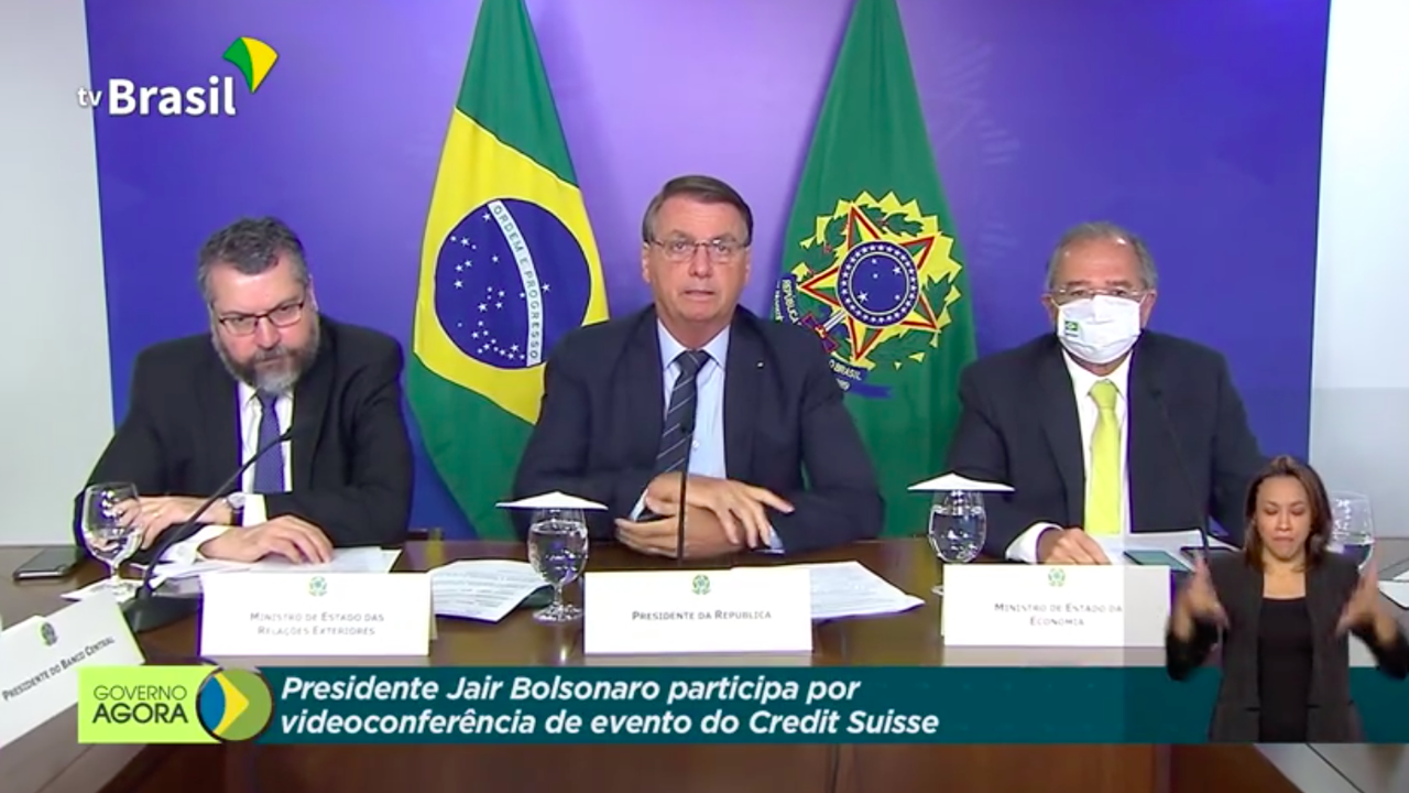 “Prezado José Olimpio Pereira, presidente da Credit Suisse, bom dia! Meus ministros Ernesto Araújo, das Relações Exteriores, e Paulo Guedes, da Economia, Roberto Campos Neto, presidente do Banco Central, Almirante Flávio Rocha, secretário de Assuntos Estratégicos, empresários e investidores do Brasil e de demais países da América Latina e do Mundo”, iniciou o presidente.