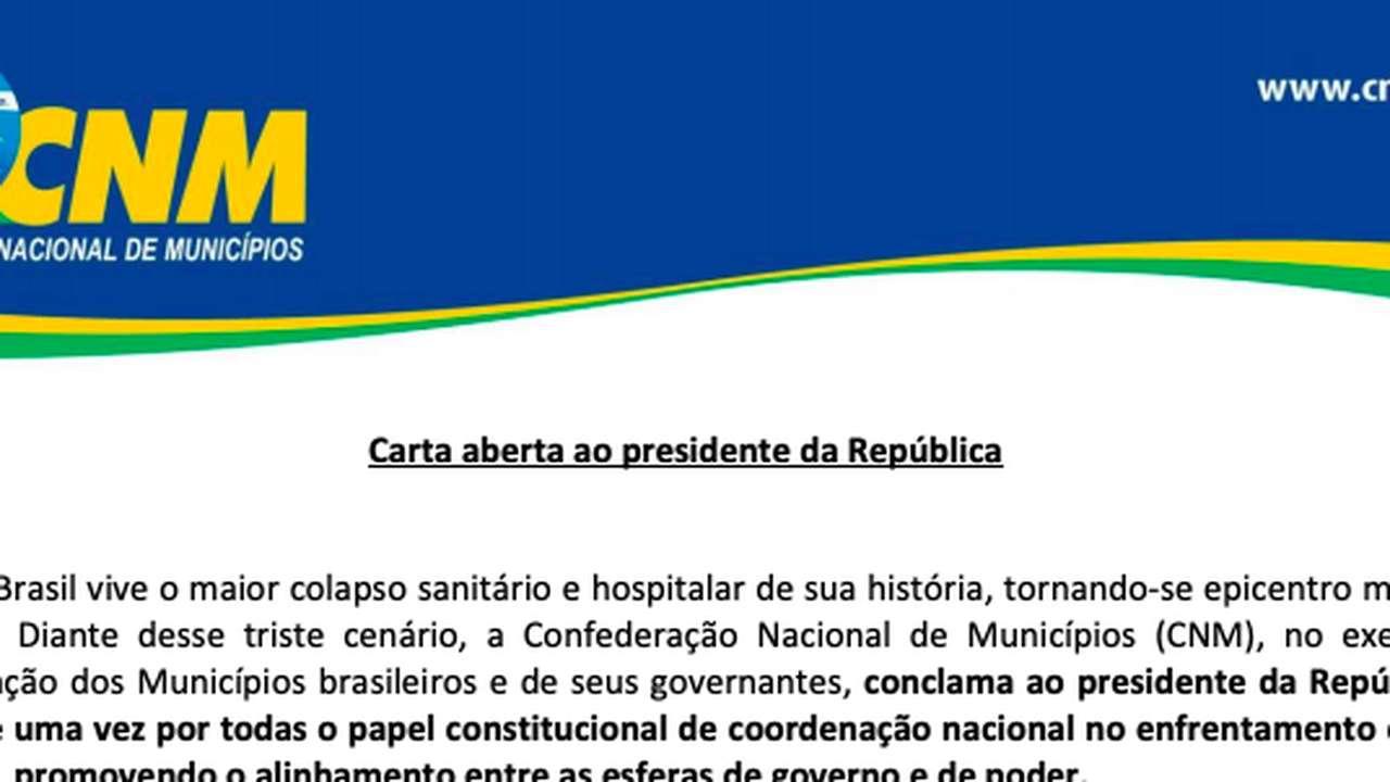 Em carta aberta divulgada nesta terça-feira, 23, assinada por Glademir Aroldi, presidente da Confederação Nacional dos Municípios(CNM) que congrega a maioria das cidades brasileiras, foi pedido que o chefe de governo e Estado, Jair Bolsonaro, assuma a coordenação da crise da pandemia do covid-19.