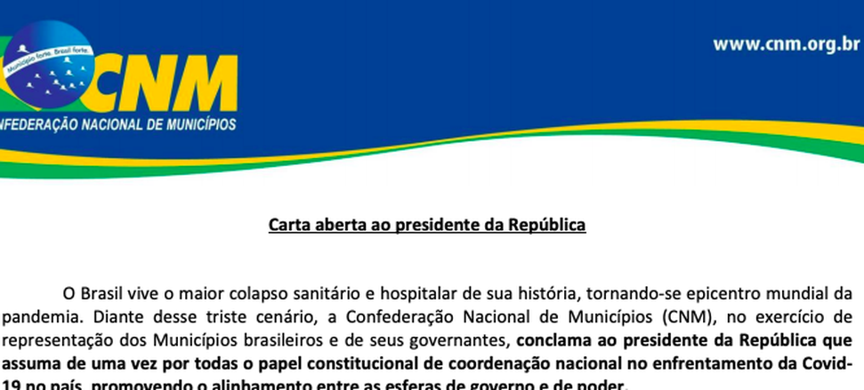 O Brasil vive o maior colapso sanitário e hospitalar de sua história, tornando-se epicentro mundial da pandemia. Diante desse triste cenário, a Confederação Nacional de Municípios (CNM), no exercício de representação dos Municípios brasileiros e de seus governantes, conclama ao presidente da República que assuma de uma vez por todas o papel constitucional de coordenação nacional no enfrentamento da Covid19 no país, promovendo o alinhamento entre as esferas de governo e de poder.