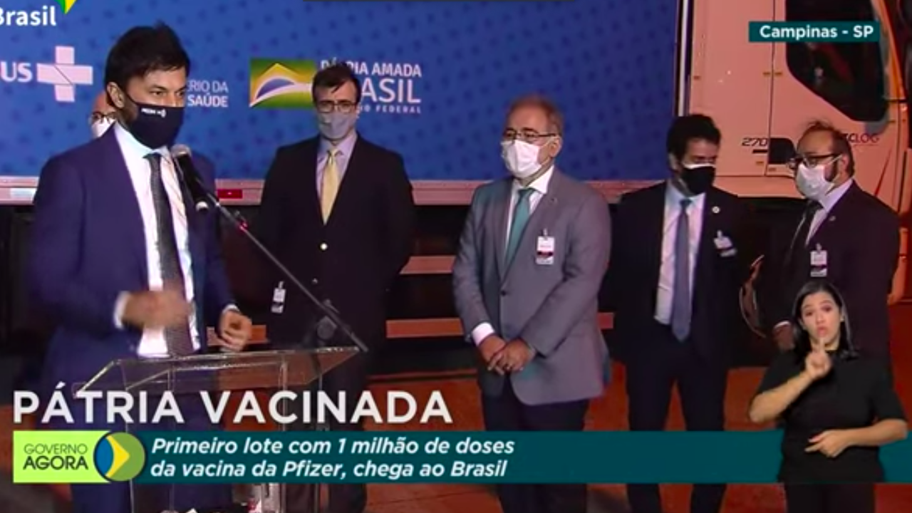 VACINA: Chega ao Brasil o primeiro lote de 1 milhão de vacinas da Pfizer/BioNTech; governo fez ato por conta da chegada do imunizante no aeroporto de Viracopos