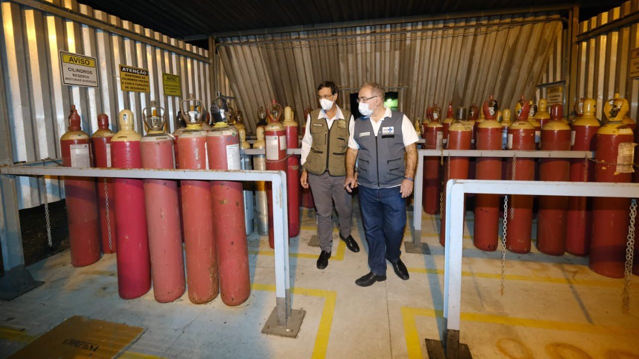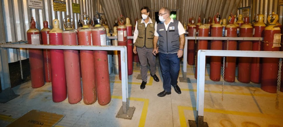 (Brasília-DF, 31/05/2021) O ministro da Saúde, Marcelo Queiroga, chegou ao Nordeste - Pernambuco, em especial - na noite desse sábado, 29, e cumpriu agenda na região também nesse domingo, 30. Ele fez vistoria em fábrica da White Martins e anunciou que as regiões Norte e Nordeste vão receber 5000 concentradores de oxigênio com o claro propósito de atender vítimas do covid-19. Ele esteve acompanhado o ministro do Turismo, Gilson Machado, que é pernambucano.