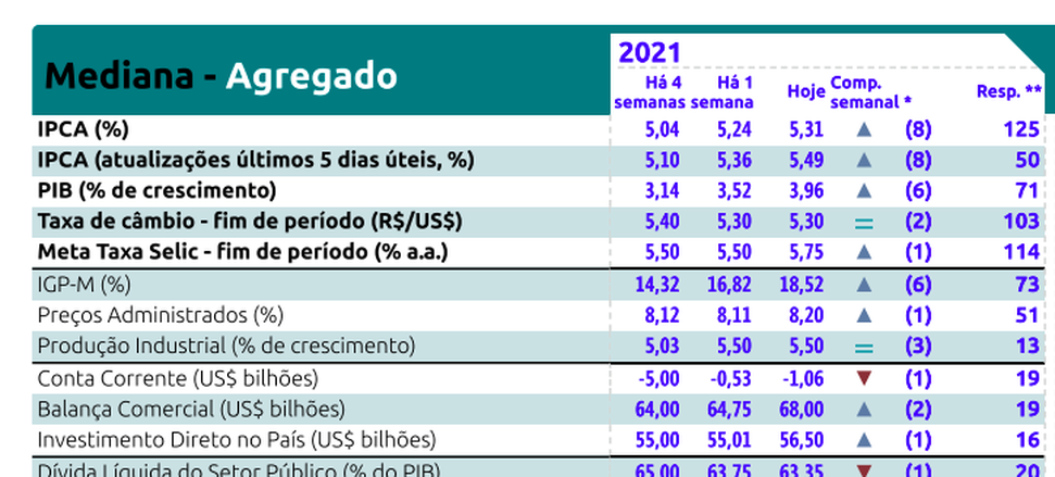 Para 2022, o IPCA é estimada em 3,68 % e PIB em 2,25%. Houve uma estimativa de queda do PIB do ano que vem. A taxa Selic para o ano que vem é estmada em 6,50 e um IGPM caindo a 4,35%.