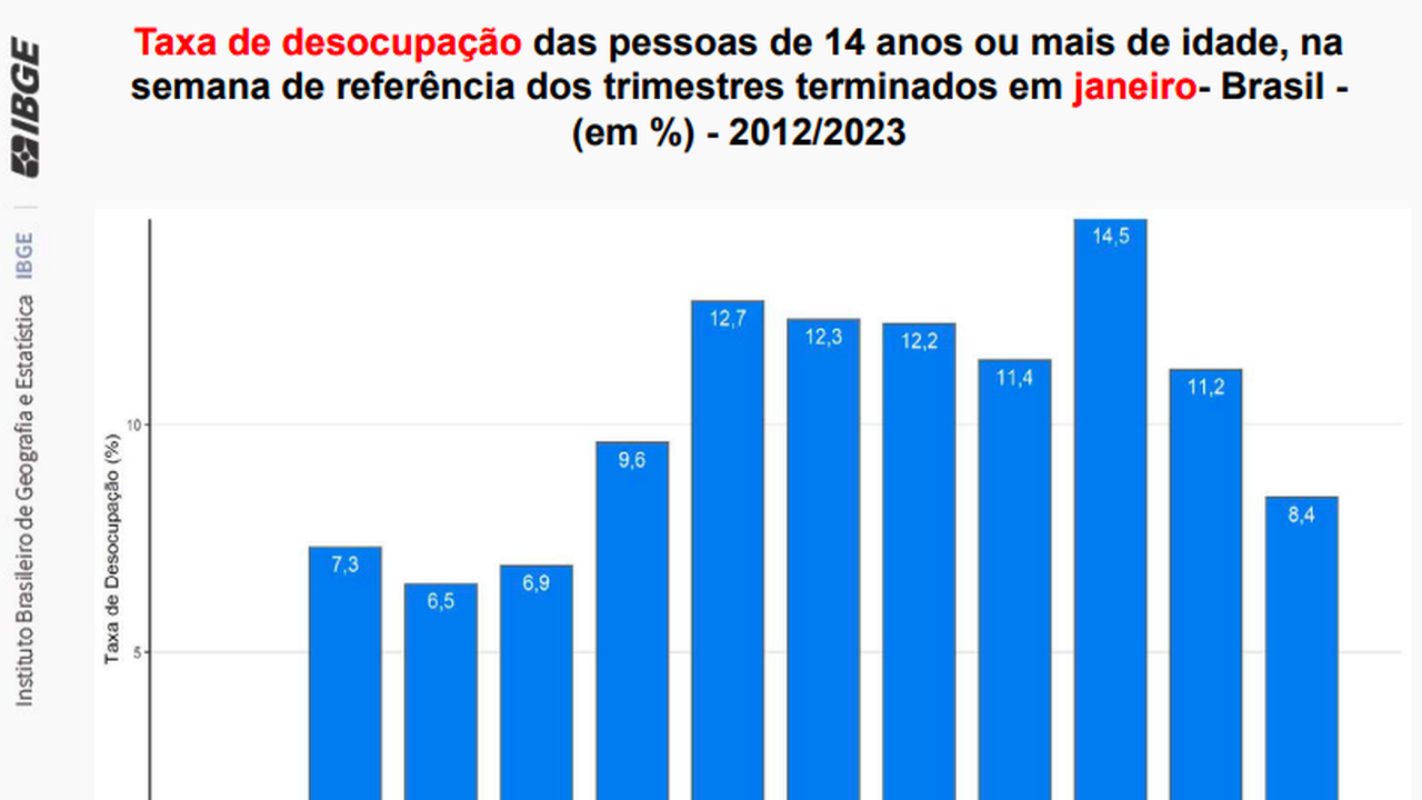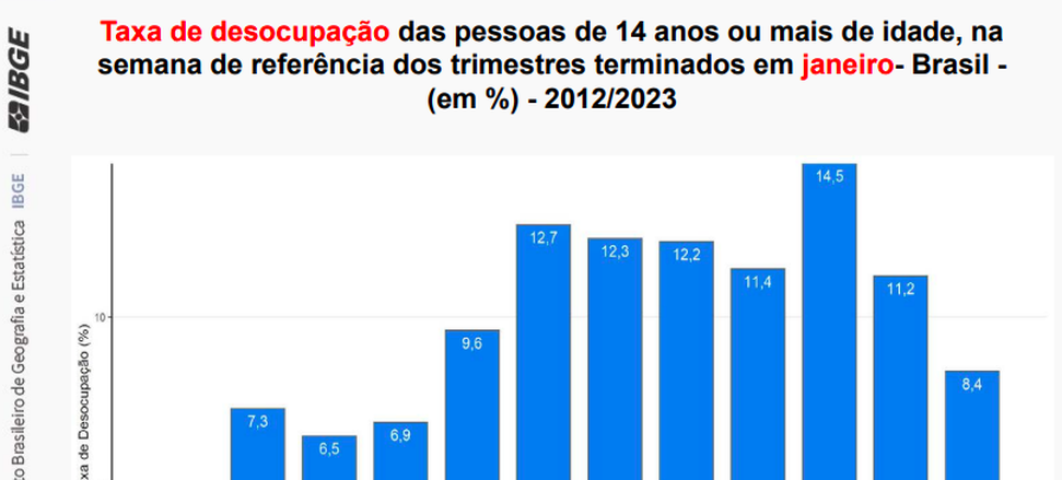 A taxa de desocupação do trimestre móvel de novembro de 2022 a janeiro de 2023 ficou estável frente ao trimestre de agosto a outubro de 2022 (8,3%) e queda de 2,9 pontos percentuais (p.p.) ante o mesmo período do ano anterior (11,2%). Foi a menor taxa de desocupação para este período desde o trimestre encerrado em janeiro de 2015 (6,9%).