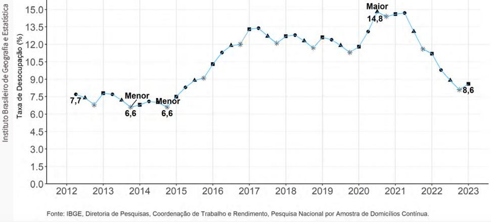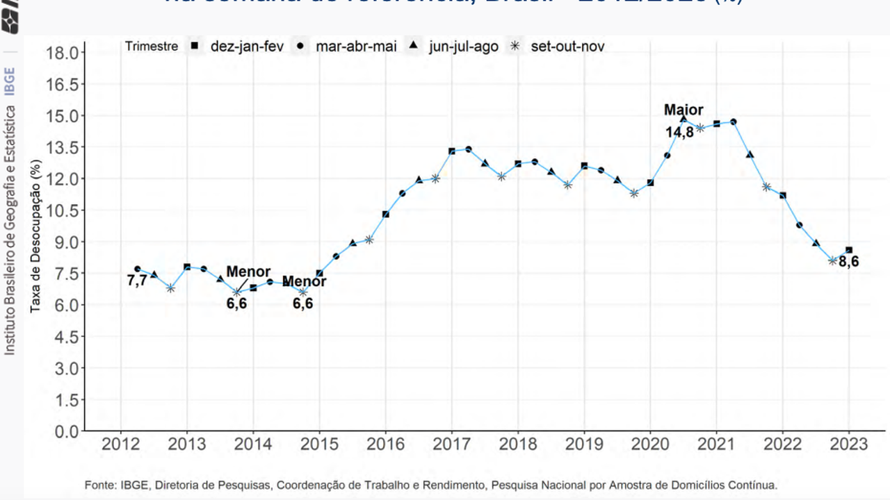 (Brasília-DF, 31/03/2023) Na manhã desta sexta-feira, 31, o IBGE divulgou sua PNAD contínua referente a dezembro-janeiro-fevereiro apontando que a taxa de desocupação chegou a 8,6% e aumentou 0,5 ponto percentual (p.p.) em relação ao trimestre de setembro a novembro de 2022 (8,1%) e recuou 2,6 p.p. ante o mesmo período do ano anterior (11,2%).