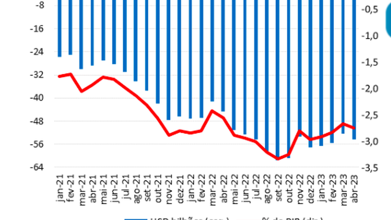 As transações correntes do balanço de pagamentos foram deficitárias em US$1,7 bilhão em abril de 2023, ante superávit de US$100 milhões em abril de 2022.
