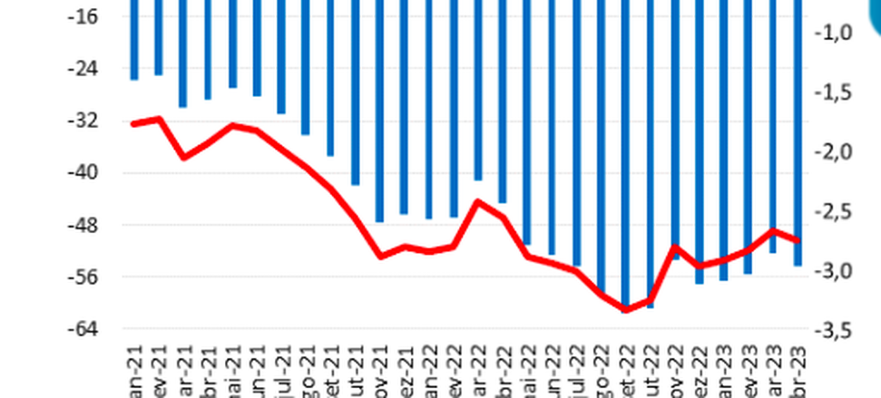 Na comparação interanual, o déficit em renda primária aumentou US$1,6 bilhão, o resultado na renda secundária reduziu US$361 milhões, houve ligeiro aumento no superávit comercial, US$118 milhões e estabilidade na conta de serviços. O déficit em transações correntes nos doze meses encerrados em abril de 2023 somou US$54,2 bilhões (2,76% do PIB), ante US$52,4 bilhões (2,67% do PIB) no mês anterior e US$44,6 bilhões (2,56% do PIB) em abril de 2022.