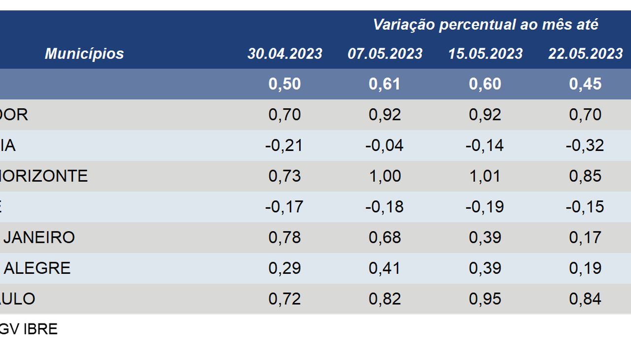 O IPC-S da cidade de Belo Horizonte (IPC-S/Belo Horizonte) da quarta quadrissemana de maio de 2023 variou 0,22%1 e acumula alta de 2,94% nos últimos 12 meses.