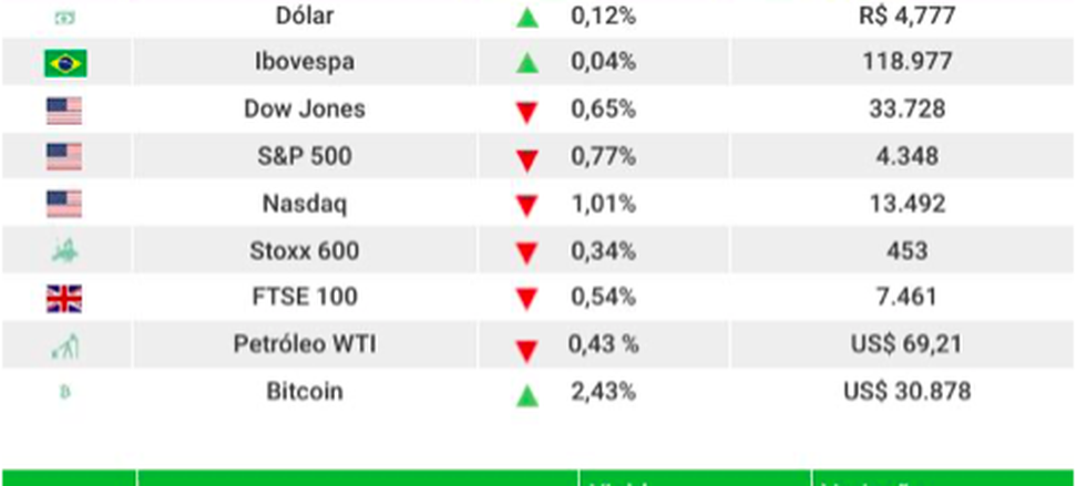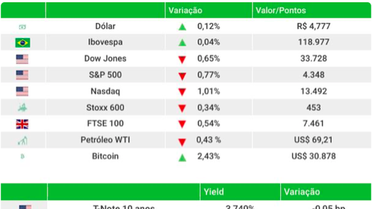 (Brasília-DF, 23/06/2023) Nesta sexta-feira, 23, o índice Ibovespa (IBOV) fechou em leve alta de 0,04% aos 118.977 pontos, perto da estabilidade. O dólar fechou em alta leve, de 0,12%, a R$ 4,777.