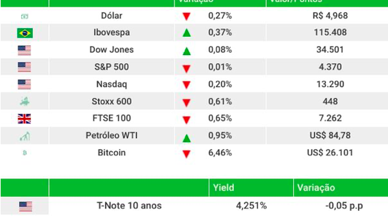 No mercado de juros futuros, a queda nos rendimentos dos Treasuries nos Estados Unidos e do DI no Brasil ajudou os ativos de risco. Os retornos dos títulos de 10 anos do Tesouro americano cederam a 4,247%, depois de terem chegado a 4,291% nesta quarta-feira (16), conforme o mercado antevê uma inflação resistente no país e juros altos por mais tempo.