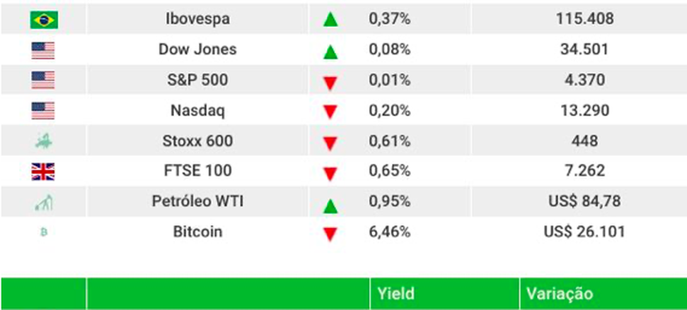 (Brasília-DF, 18/08/2023) O Ibovespa teve o primeiro pregão em alta do mês de agosto, depois de 13 sessões de queda. O índice subiu 0,37% nesta sexta-feira, fechando aos 115.408,52 pontos. O dólar caiu 0,27%, a R$ 4,968. Durante o pregão, a moeda americana chegou a R$ 5,002.
