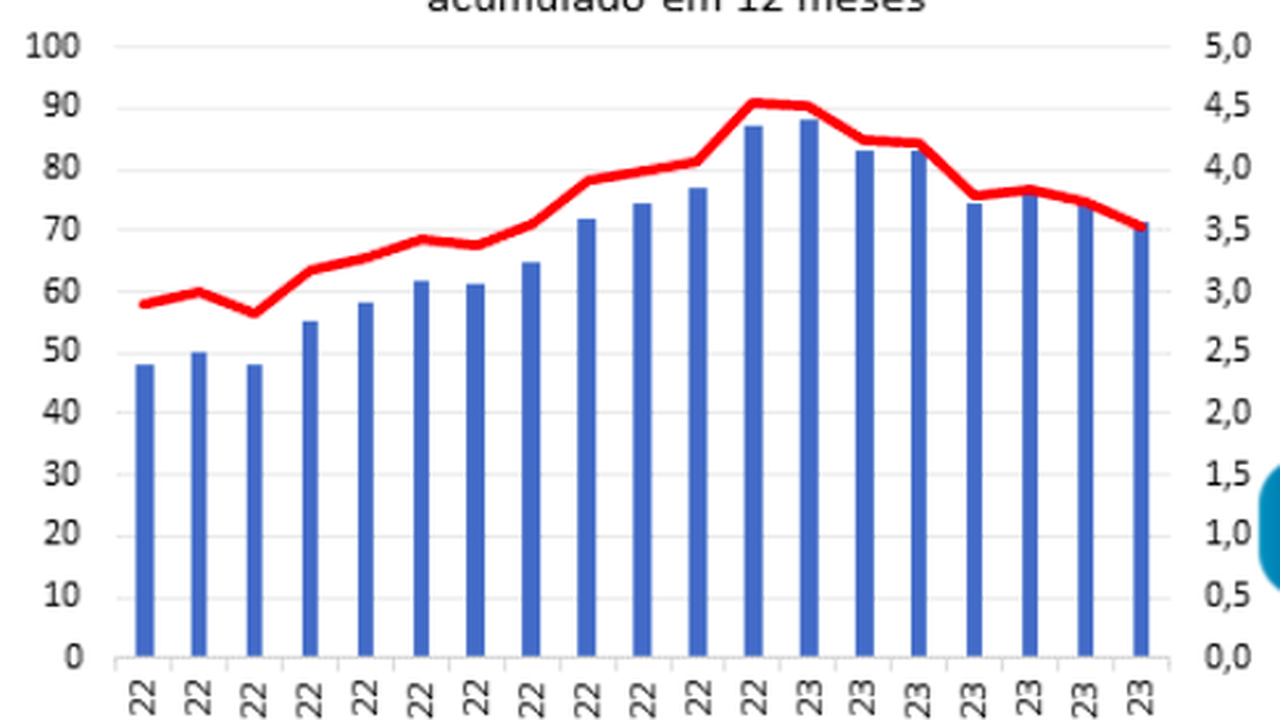 Na comparação interanual, o superávit comercial aumentou US$3,1 bilhões, o déficit de serviços manteve-se estável, e o déficit em renda primária cresceu US$1,2 bilhão. O déficit em transações correntes nos doze meses encerrados em julho de 2023 somou US$51,1 bilhões (2,52% do PIB), ante US$52,7 bilhões (2,64% do PIB) no mês anterior e US$48,8 bilhões (2,71% do PIB) em julho de 2022.