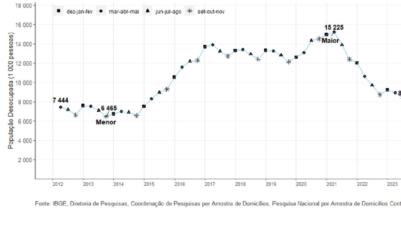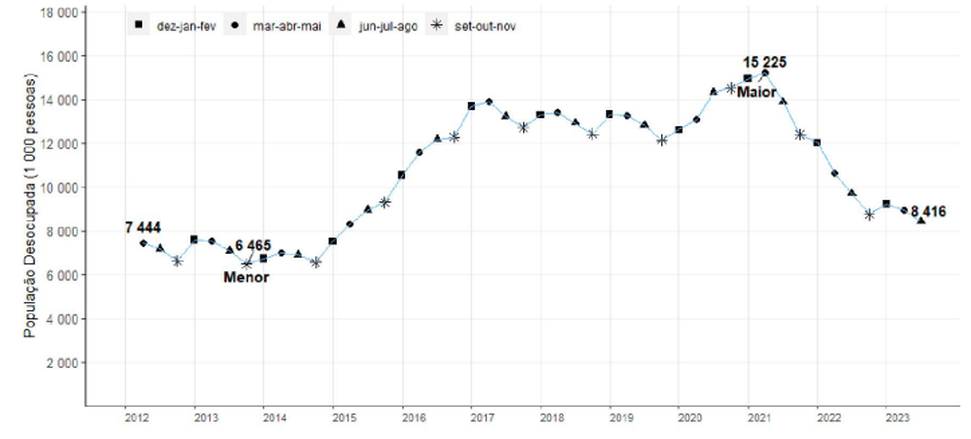 A população desocupada (8,4 milhões) recuou 5,9% (menos 528 mil pessoas) no trimestre e caiu 13,2% (menos 1,3 milhão de pessoas) no ano. Foi o menor contingente desde o trimestre móvel encerrado em junho de 2015 (8,5 milhões)