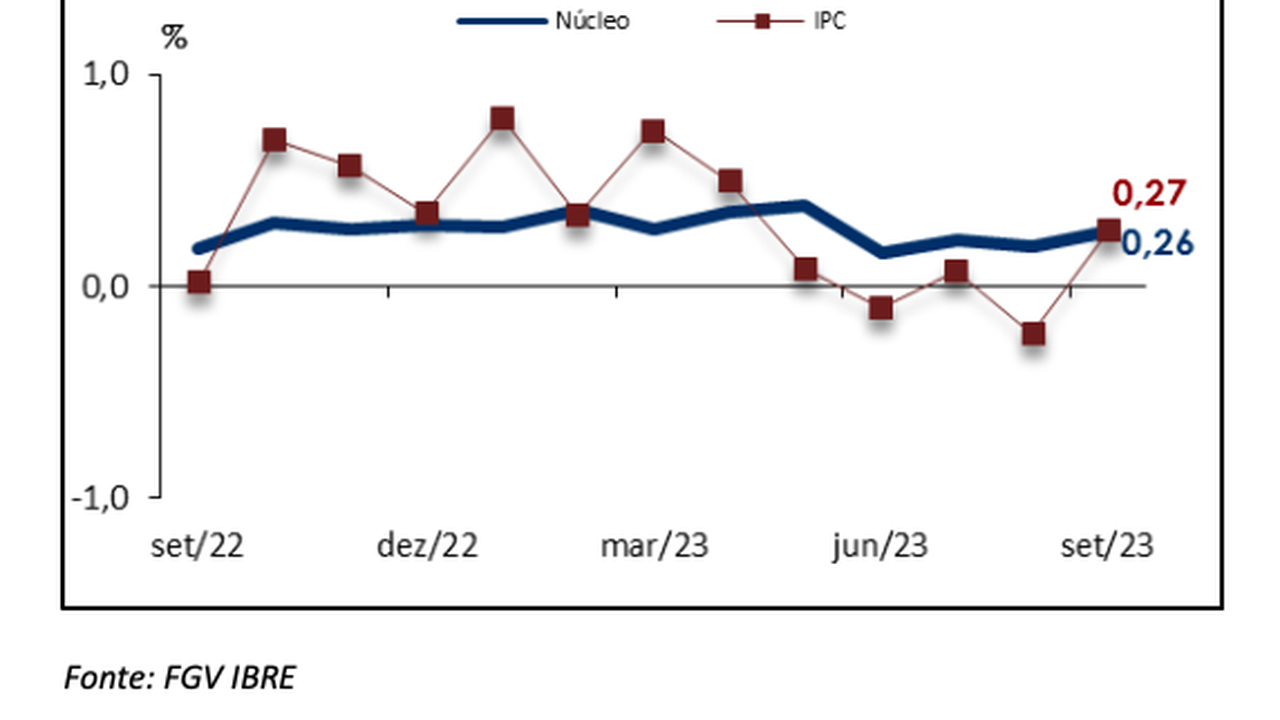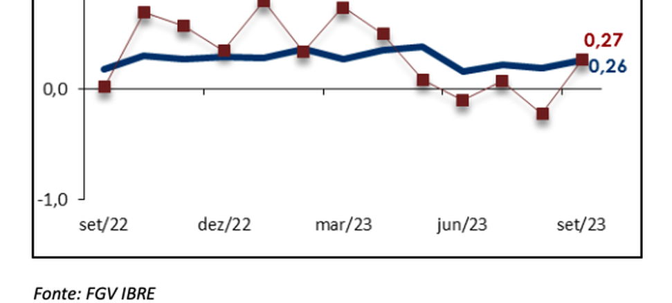 No mês anterior, a taxa havia sido de 0,05%. Com este resultado, o índice acumula variação de -4,88% no ano e de -5,34% em 12 meses. Em setembro de 2022, o índice havia caído 1,22% e acumulava elevação de 7,94% em 12 meses.
