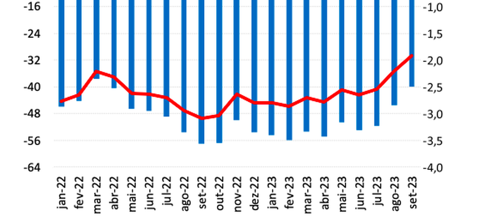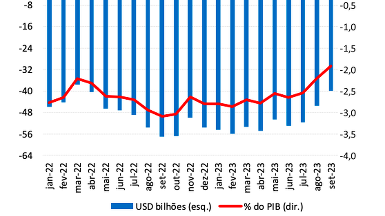 O déficit em transações correntes nos doze meses encerrados em setembro de 2023 somou US$39,8 bilhões (1,92% do PIB), ante US$45,4 bilhões (2,21% do PIB) no mês anterior e US$56,9 bilhões (3,09% do PIB) em setembro de 2022.