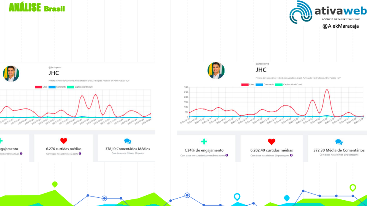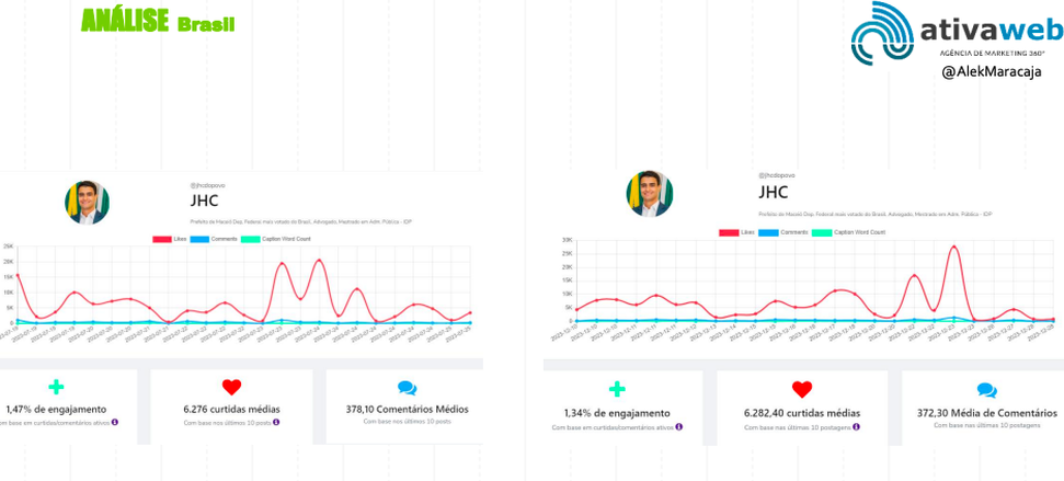 João Henrique Caldas (JHC) - Maceió (AL) Engajamento: Diminuiu de 1,47% para 1,34%. Curtidas: Praticamente estável, ligeiro aumento de 6,276 para 6,282.40 médio. Comentários: Pequena diminuição de 378,10 para 372,30 médio. Novos Seguidores: 44.922. Total de Seguidores: 497.706