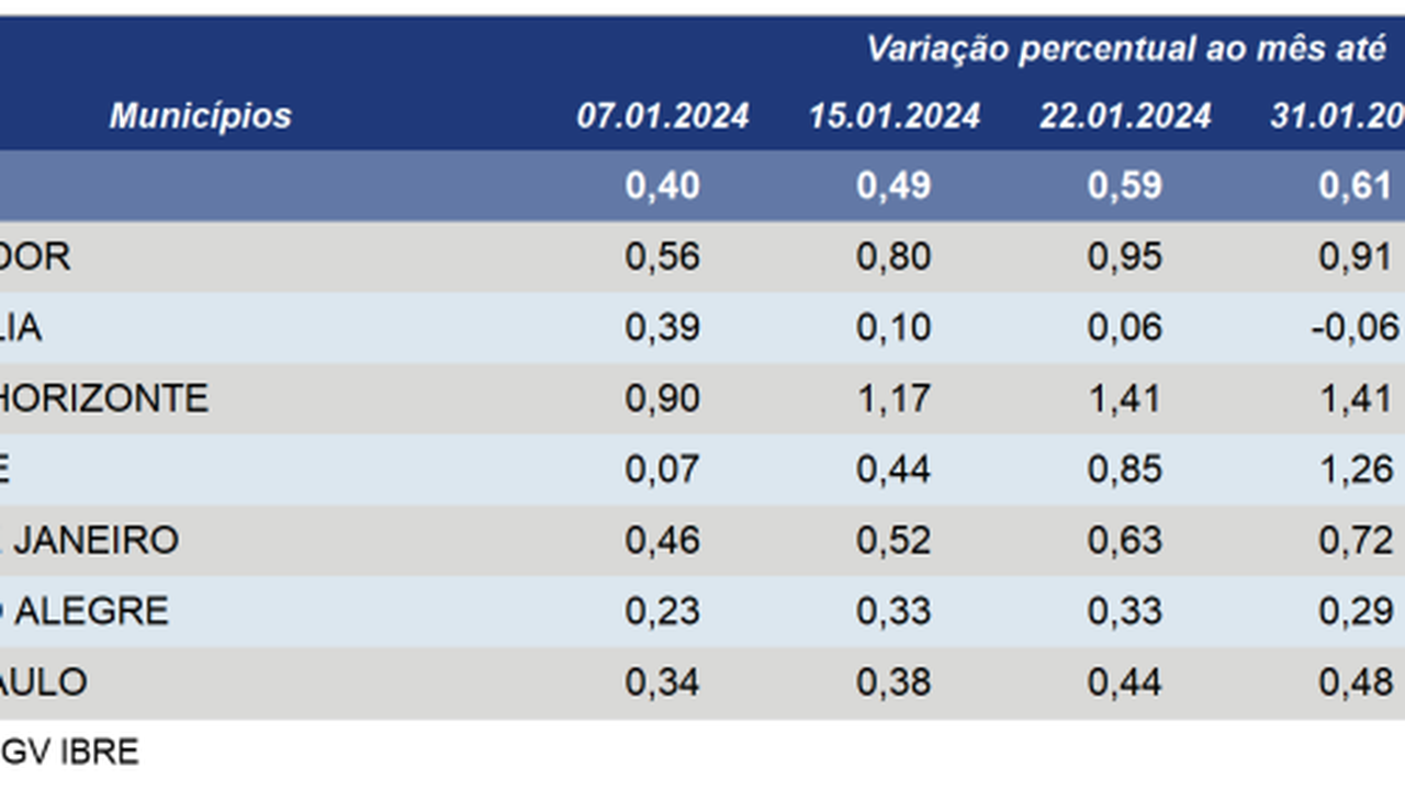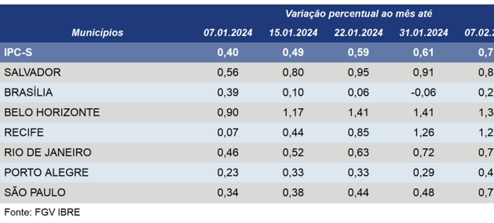 (Brasília-DF, 09/02/2024). Nesta sexta-feira, 09, o FGV-IBRE divulgou o IPC-S da primeira quadrissemana de fevereiro de 2024 subiu 0,75% e acumula alta de 3,79% nos últimos 12 meses. Quatro das sete capitais pesquisadas registraram acréscimo em suas taxas de variação.