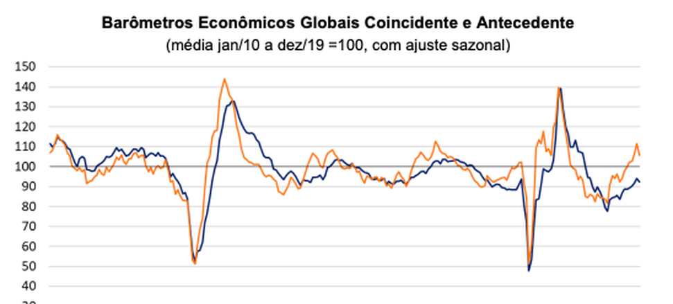 O Barômetro Econômico Global Coincidente recua 1,6 ponto e o Barômetro Antecedente, recua 6,0 pontos em fevereiro, passando a 92,4 pontos e 105,5 pontos, respectivamente. Em ambos os casos, a região da Ásia, Pacífico & África exerce a maior contribuição para a queda, enquanto as demais regiões contribuem de forma discreta e em direções variadas. A distância entre os indicadores diminui no mês, mas permanece elevada, em 13,1 pontos.