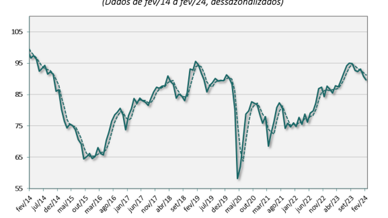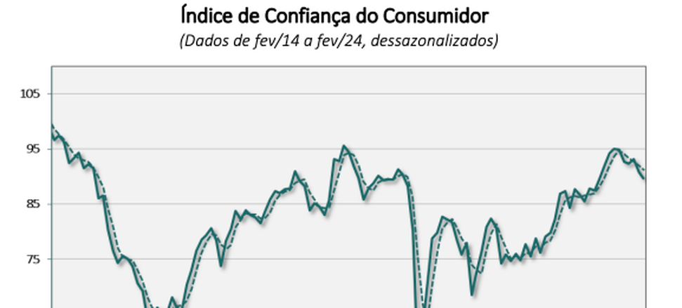 (Brasília-DF, 23/02/2024). Na manhã desta sexta-feira, 23, o FGV-IBRE divulgou o seu Índice de Confiança do Consumidor (ICC) que recuou 1,1 ponto em fevereiro, para 89,7 pontos, menor nível desde maio de 2023 (89,5 pontos). Em médias móveis trimestrais, o índice recuou pelo quinto mês consecutivo, em 0,9 ponto, para 91,2 pontos.