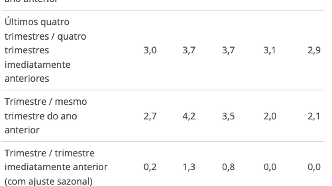 Frente ao 3º trimestre, na série com ajuste sazonal, o PIB apresentou estabilidade (0,0%). A Indústria avançou 1,3%, os Serviços apresentaram variação positiva de 0,3%, enquanto a Agropecuária recuou 5,3%.