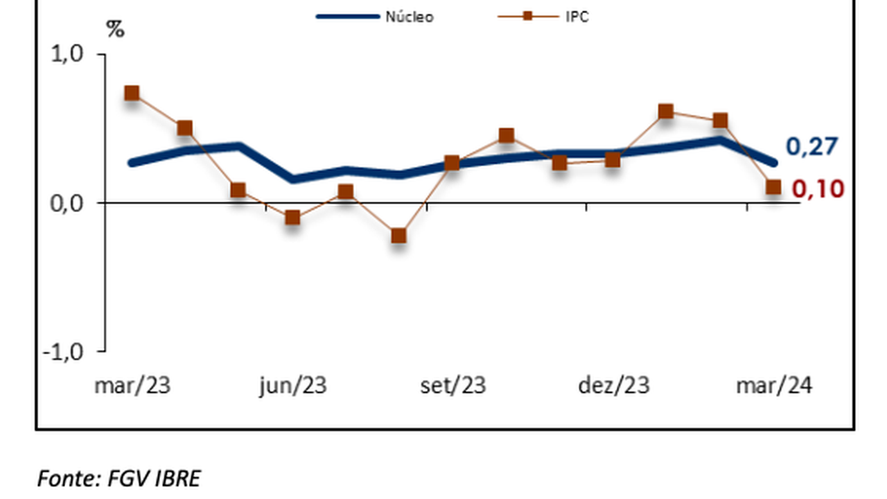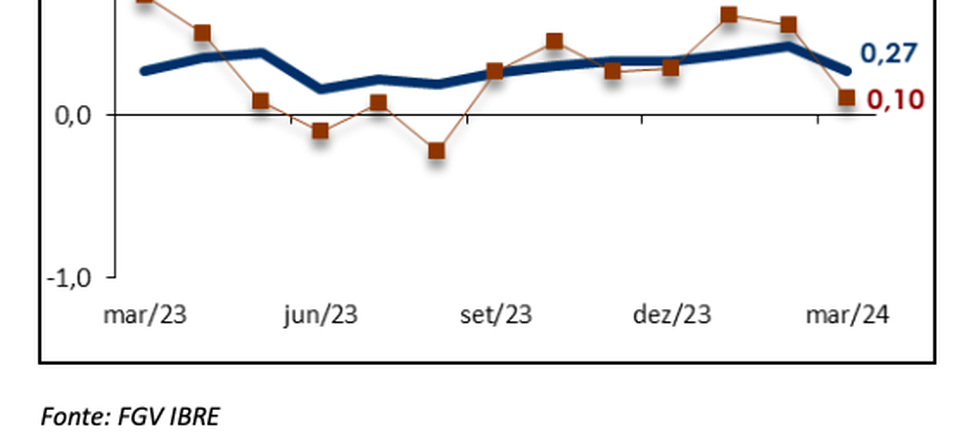 No mês de fevereiro, a taxa havia sido de -0,41%. Com este resultado, o índice acumula queda de -0,97% no ano e de -4,00% em 12 meses. Em março de 2023, o índice havia variado -0,34% e acumulava queda de -1,16% em 12 meses.