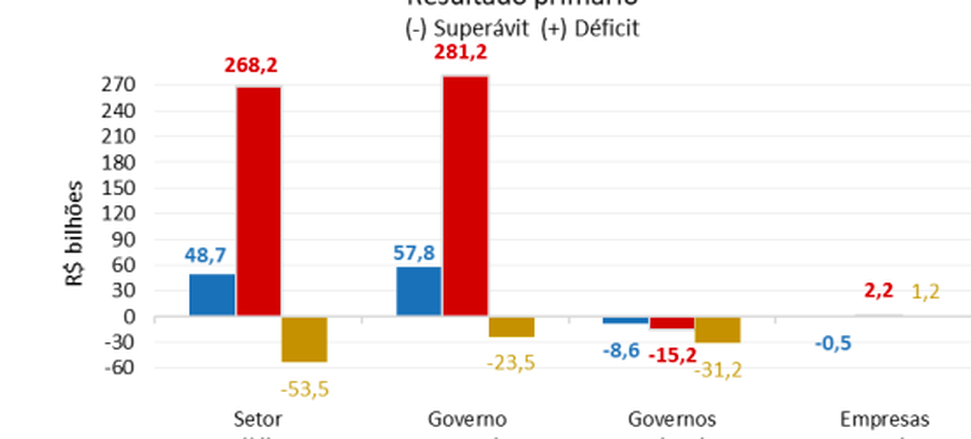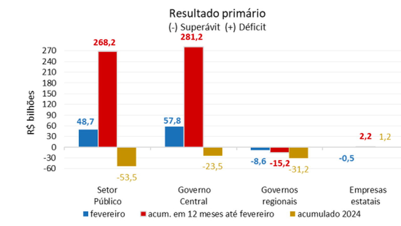 O resultado primário do setor público consolidado foi deficitário em R$48,7 bilhões em fevereiro, ante déficit de R$26,5 bilhões no mesmo mês de 2023. O Governo Central registrou déficit de R$57,8 bilhões, e os governos regionais e as empresas estatais, superávits respectivos de R$8,6 bilhões e de R$483 milhões. Em doze meses, o setor público consolidado acumula déficit de R$268,2 bilhões, equivalente a 2,44% do PIB e 0,19 p.p. superior ao déficit acumulado até janeiro.