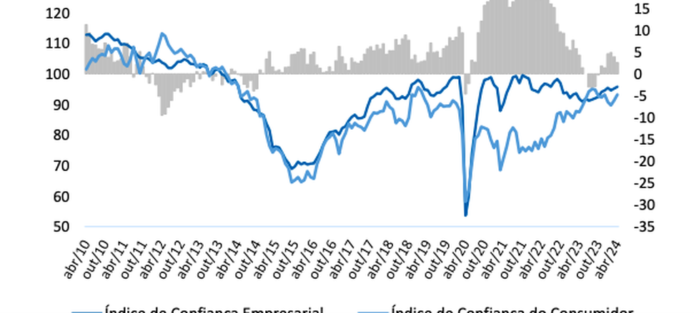 (Brasília-DF, 03/05/2024) A FGV-IBGE divulgou nesta sexta-feira, 03, a sua Síntese das Sondagens de abril que apontam a Confiança do Consumidor e Empresarial melhorando. Percepções sobre o presente e futuro melhoram entre empresários.