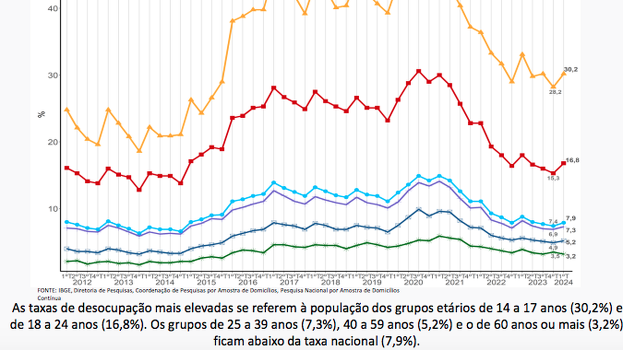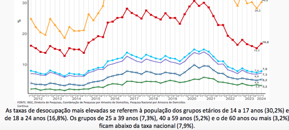 (Brasília-DF, 17/05/2024) O IBGE divulgou na manhã desta sexta-feira, a sua PNAD Contínua Mensal mostrando que a taxa de desocupação do país no primeiro trimestre de 2024 aumentou entre os jovens. As taxas de desocupação mais elevadas se referem à população dos grupos etários de 14 a 17 anos (30,2%) e de 18 a 24 anos (16,8%). Os grupos de 25 a 39 anos (7,3%), 40 a 59 anos (5,2%) e o de 60 anos ou mais (3,2%) ficam abaixo da taxa nacional (7,9%).