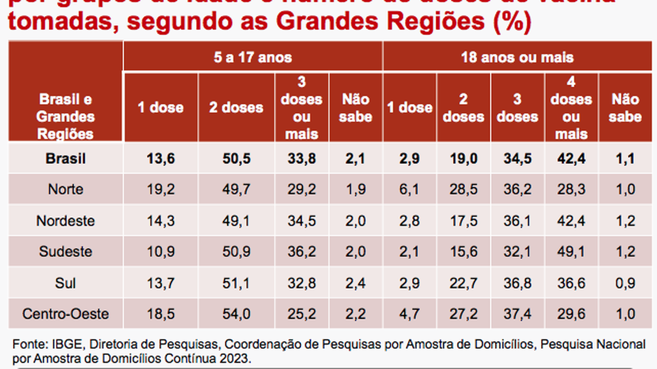 Com relação à faixa etária, os percentuais de pessoas de 5 a 17 anos e de 18 anos ou mais que tomaram todas as doses recomendadas foram similares na Região Sudeste; maior entre os adultos nas regiões Norte e Nordeste; e maior entre as crianças e adolescentes nas regiões Sul e Centro-Oeste.