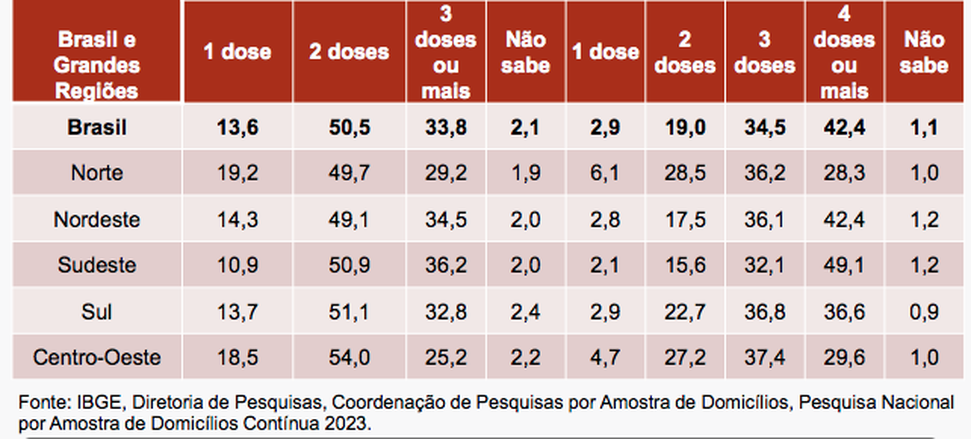Entre as pessoas de 5 anos ou mais de idade que tomaram alguma dose de vacina contra a doença, mais da metade (58,6%) disseram ter tomado todas aquelas recomendadas para si até o primeiro trimestre de 2023, com maior proporção entre os moradores das áreas urbanas (59,5%) do que entre moradores das áreas rurais (51,8%) e maior proporção entre as mulheres (60,4%) do que entre os homens (56,5%).