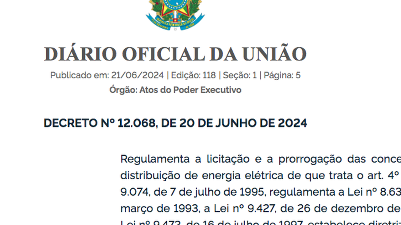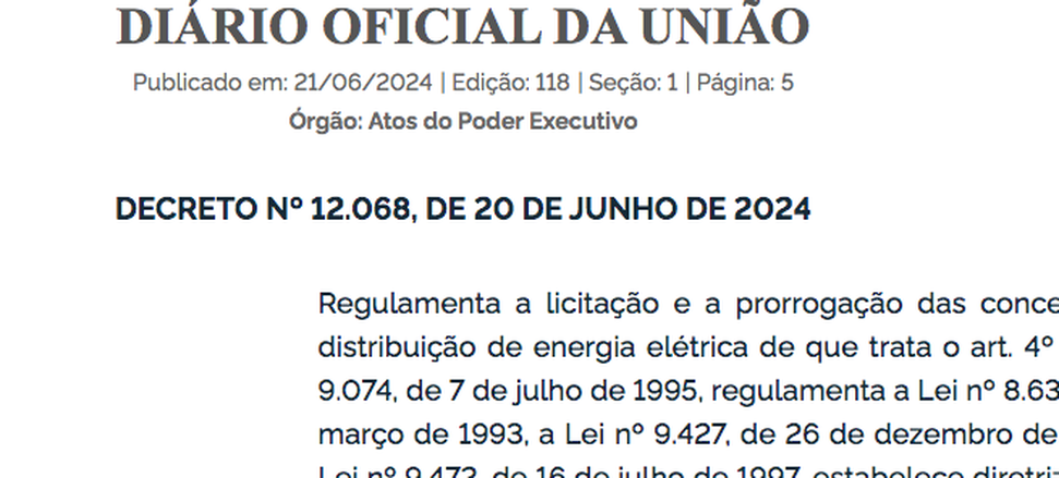 (Brasília-DF, 21/06/2024) No final da manhã desta sexta-feira, 20, foi publicada no Diário Oficial da União(DOU) o novo decreto que “aperta” as diretrizes para os novos contratos de distribuição de energia elétrica. Veja a íntegra do decreto AQUI.
