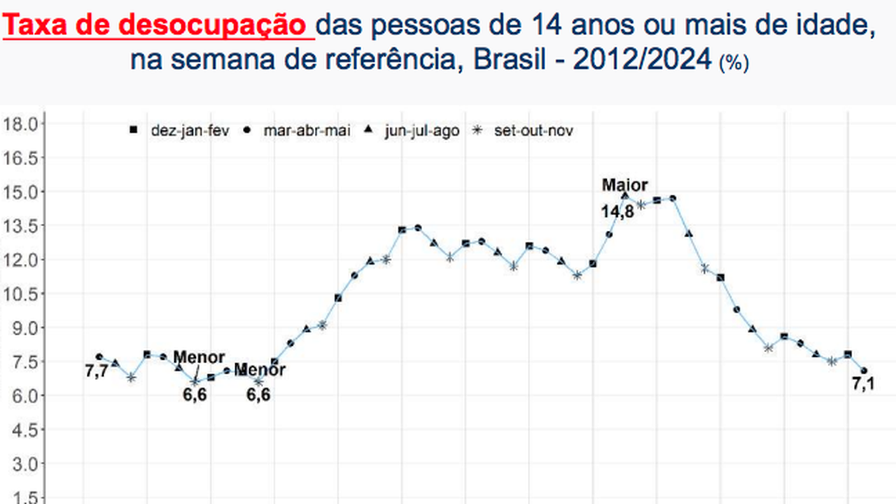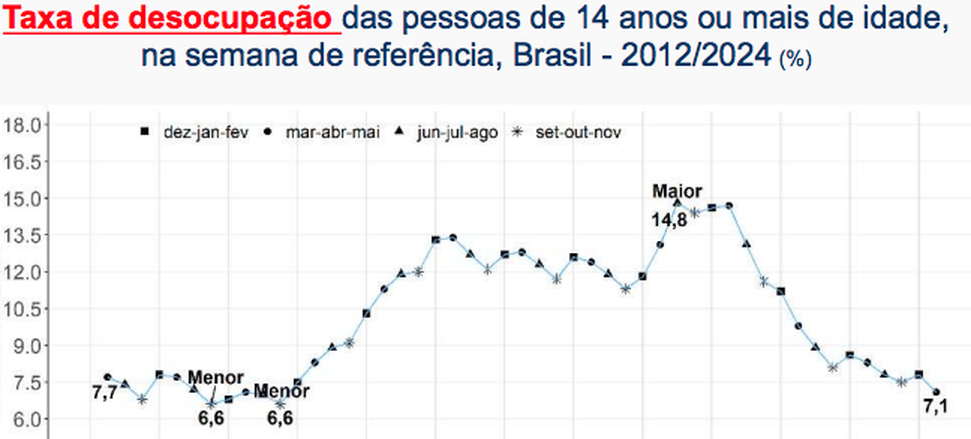 (Brasília-DF, 28/06/2024). O IBGE divulgou nesta sexta-feira, 28, que a taxa de desocupação chegou a 7,1% no trimestre encerrado em maio de 2024 recuou 0,7 ponto percentual (p.p.) frente ao trimestre de dezembro a fevereiro de 2024 que fi de 7,8% e caiu 1,2 p.p. ante o mesmo trimestre móvel de 2023 qual foi de 8,3%. Essa foi a menor taxa de desocupação para um trimestre encerrado em maio desde 2014 - 7,1%.