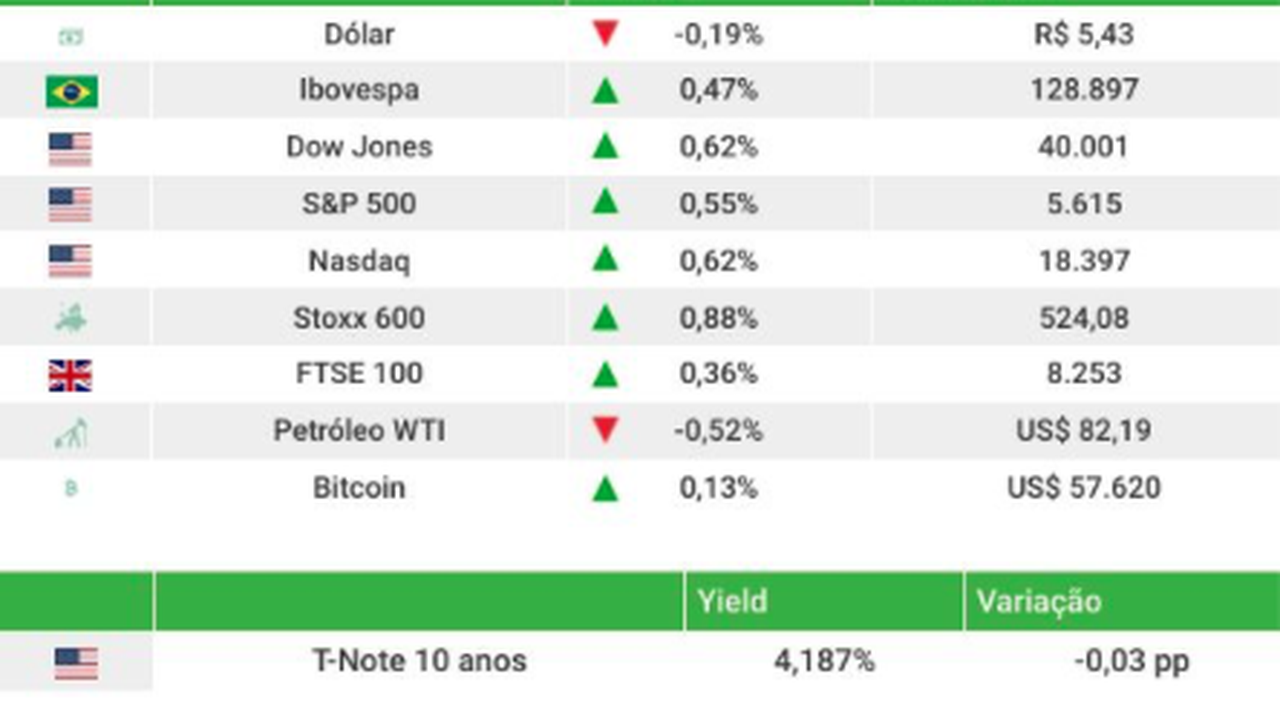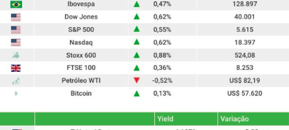 (Brasília-DF, 12/07/2024). Nesta sexta-feira,12, o Ibovespa fechou em alta de 0,47%, aos 128.897 pontos, depois que novos dados de inflação nos Estados Unidos ajudaram a reforçar o sentimento de otimismo nos mercados internacionais, com a perspectiva de que o Federal Reserve pode cortar os juros em setembro.