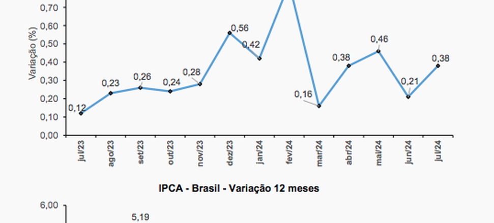 (Brasília-DF, 09/08/2024) Na manhã desta sexta-feira, 09, foi divulgada a aguardada inflação do mês de julho, o IPCA (Índice Nacional de Preços ao Consumidor Amplo) do IBGE apontou que chegou a 0,38%, ficando 0,17 ponto percentual (p.p.) acima da taxa registrada em junho (0,21%).