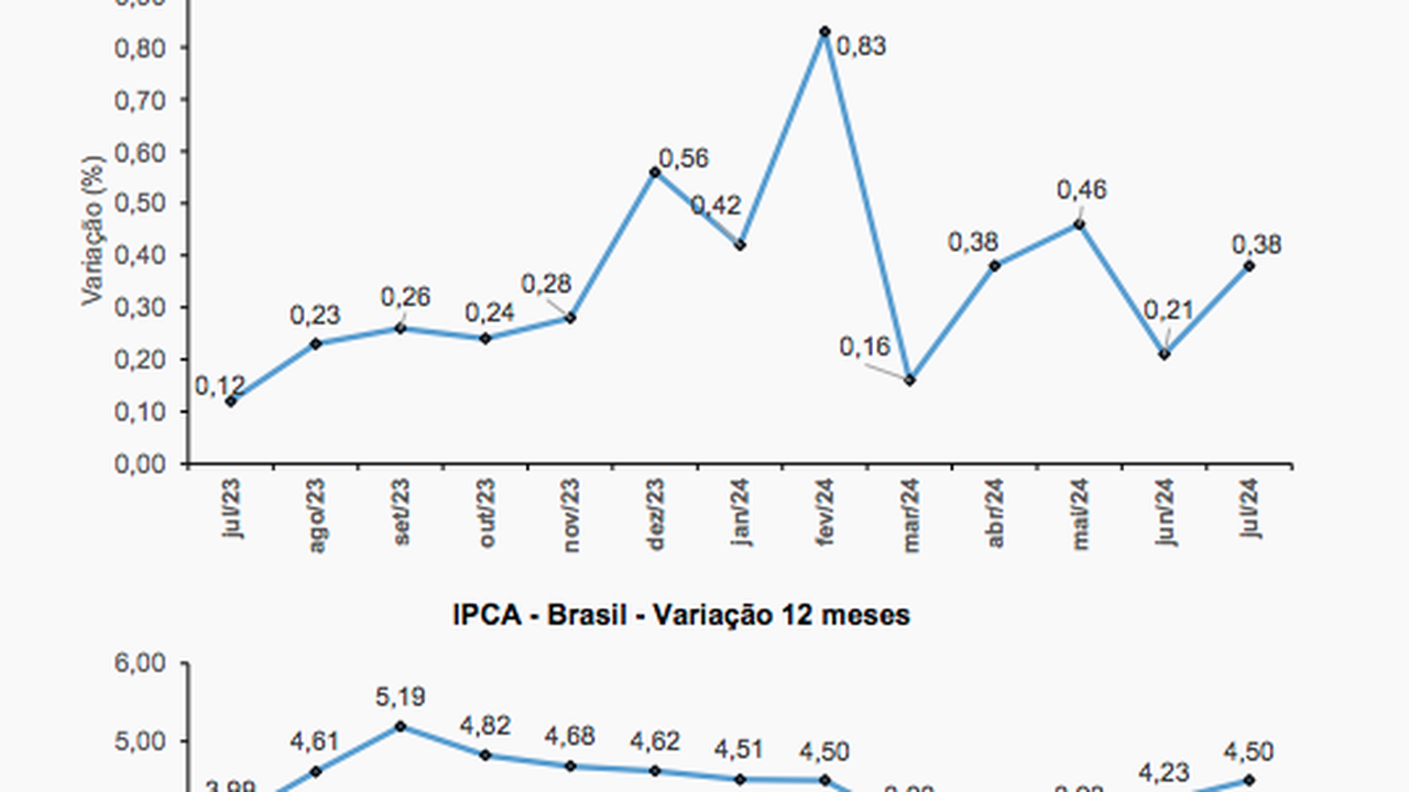 No ano, o IPCA acumula alta de 2,87% e, nos últimos 12 meses, de 4,50%, acima dos 4,23% observados nos 12 meses imediatamente anteriores. Em julho de 2023, a variação havia sido de 0,12%.