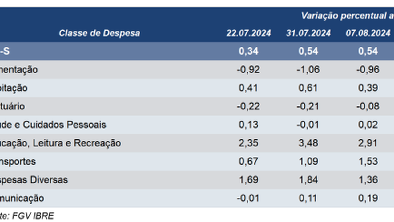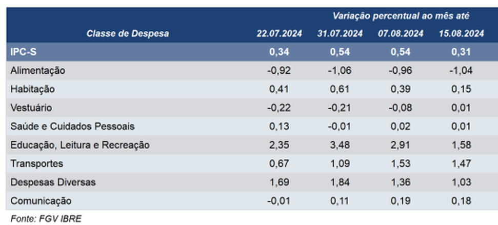 Nesta apuração, seis das oito classes de despesa componentes do índice registraram decréscimo em suas taxas de variação. A maior contribuição para o resultado do IPC-S partiu do grupo Educação, Leitura e Recreação cuja taxa de variação passou de 1,58%, na segunda quadrissemana de agosto de 2024 para 0,52% na terceira quadrissemana de agosto de 2024. Nesta classe de despesa, cabe mencionar o comportamento do item passagem aérea, cujo preço variou 2,50%, ante 8,09% na edição anterior do IPC-S.