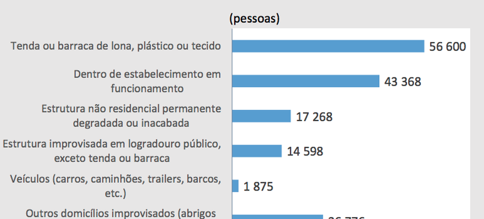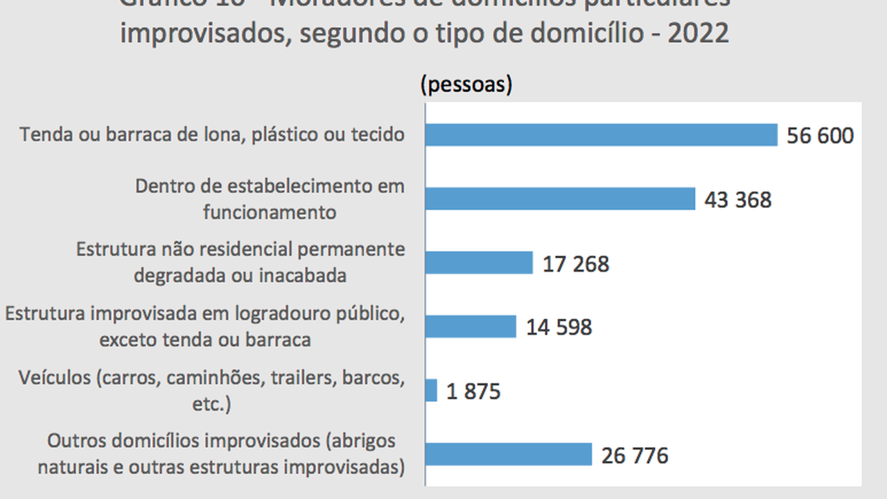 Censo 2022, com atualizações, mostra que 160 mil pessoas viviam em domicílios particulares improvisados, ou seja em calçadas, praças ou viadutos e em abrigos naturais, bem como em estruturas móveis
