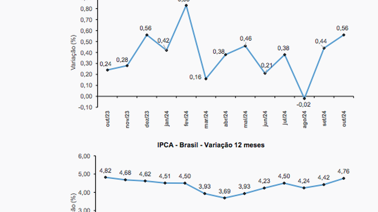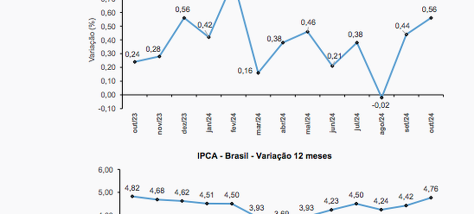 Em outubro o IPCA foi de 0,56% e ficou 0,12 ponto percentual acima da taxa de setembro (0,44%). No ano, o IPCA acumula alta de 3,88% e, nos últimos 12 meses, de 4,76%, acima dos 4,42% observados nos 12 meses imediatamente anteriores. Em outubro de 2023, a variação havia sido de 0,24%. O teto da meta do Banco Central era de 4,50% e o centro da meta era de 4,30%.